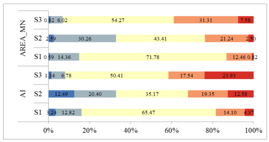 Proportion of each level of AI and AREA_MN predicted in different scenarios (the dark blue color represents a sharp decline, the light blue color represents a moderate decline, the yellow color represents a slight change, the light red color represents a moderate increase, and the dark red color represents a sharp increase).