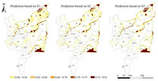 This study sets corresponding biodiversity prediction scenarios (S1, S2 and S3) based on the policy stages outlined previously; these are wetland biodiversity patterns that will continue to develop from land use policies in each stage until 2025. In S1, S2 and S3, the biodiversity pattern was, respectively, predicted from the land use transfer pattern at the start and end of the promoting stage, strengthening stage and stabilizing stage.