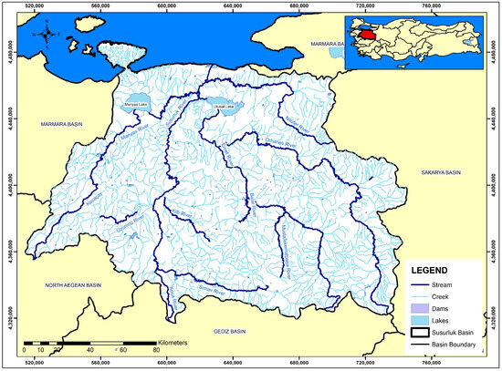The Susurluk basin, which covers approximately 24,319 km2 and represents 3.1% of Türkiye’s surface area, is highly susceptible to flooding due to its hydrological and climatic characteristics. With key urban centers, such as Balıkesir, Bursa, and Canakkale, within its boundaries, floods in this basin have the potential to cause extensive socioeconomic and environmental damage. Historical records indicate that major flood events in the region have led to considerable financial losses and disruptions to local communities [4,5].