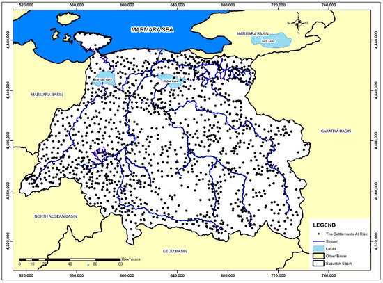 In the Flood Risk Preliminary Assessment Report, locations with flood risk were identified within the Susurluk Basin with the criteria specified by anthropogenic effects and disaster risk factors. Accordingly, 1543 settlements were examined throughout the Susurluk basin. Of these, 298 settlements were determined to be at preliminary risk of flooding, and 2116 km of hydrodynamic modeling studies were regarded as necessary in 466 creeks [12].