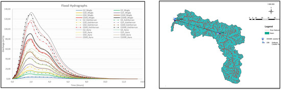 Within the scope of hydrology studies, flood hydrographs were calculated using stochastic and statistical methods and hydrological models (HEC-HMS) for all necessary outlet points on the streams under flood risk. A lumped hydrological model solution method within the HEC-HMS model was used for hydrological modeling. Hydrological analyses of creek tributaries with sufficient basin size were determined by establishing a hydrological model. The Thornthwaite method was selected to calculate potential evapotranspiration in this study. For the creeks in all the settlements at risk (466 creeks), hydrological studies were conducted by flood frequency at a gauging station, regional flood frequency, and synthetic methods accepted in the literature, such as SCS, Mockus, and Snyder unit hydrographs. In flood frequency analyses, Gumbel and Log-Pearson Type-3 distributions are generally found to be appropriate. Chi-square (X2) and Kolmogorov–Smirnov goodness-of-fit-tests were performed to determine the best distribution. Peak flows and hydrographs of floods with return periods of 2, 5, 10, 50, 100, 500, and 1000 years were calculated by the selected classical method that best fit the observed stream hydrographs. The results of the synthetic methods applied for rainfall runoff analysis were used more than the results of the flood frequency analyses. To put it more explicitly, over 700 flood hydrograph calculations were performed for approximately 503 hydrodynamic models. There is a limited number of flow observation stations with long-term data on the main river branches. However, there are several meteorological observation stations with records covering 60 years and more throughout the Susurluk basin.