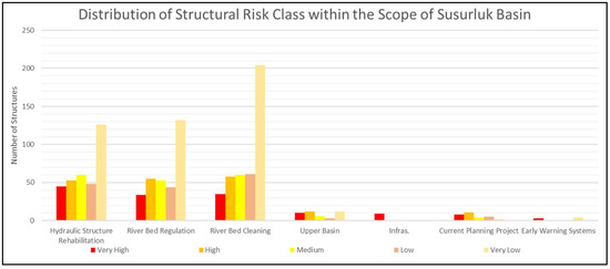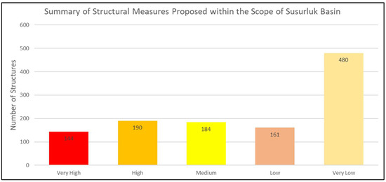 Structural measures (1159 in total) that should be implemented before flooding in settlements where flooding is expected to occur were identified. Summary information about the determined structural measures and distribution of risk classes is given in Figure 11 and Figure 12.