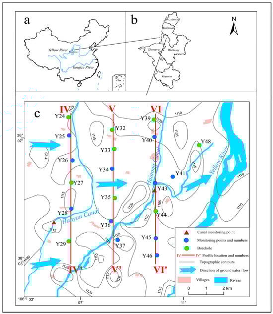 Located in the southern part of Ningxia Hui Autonomous Region, the study area is the middle and front part of the alluvial fan formed by the Yellow River at the narrows of the Qingtongxia Gorge, where the Yellow River flows in a southwest–northeast direction on the east side, so that the terrain is slightly higher in the southwest than the northeast parts, and slightly tilted toward the Yellow River (Figure 1). The area is about 20 km long, 15 km wide, and covers an area of about 300 km2. With flat and open terrain and fertile land, it is one of the oldest irrigation areas along Yellow River in China [35]. Water from the Yellow River is diverted to irrigate farmland in the study area. The two irrigation canals, Huinong Canal and Hanyan Canal, pass through the middle of the study area. The Yellow River is at the furthest east side of the study area. The aquifer in this area is mainly recharged from percolation of agricultural irrigation [36].