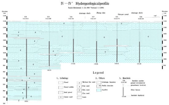 A large number of field geological drilling, geophysical prospecting, and engineering geological drilling were carried out during the survey in the study area in 2017, and seven exploration lines were laid in the roughly perpendicular to groundwater flow direction with a separate distance of 2.5 km. The distance of between two adjacent boreholes is 1.5 km, and 20 exploration boreholes were completed. Three hydrogeological sections are completed by interpolation of lithology based on borehole data, each of which was similar in lithology, such as profile IV–IV’ shown in Figure 2. The depth of the wells was from 100 to 180 m, and the length of the screen pipe was between 54 and 70 m. In order to implement the river stage tomography test, we selected 20 exploration wells for groundwater level monitoring. Among them, monitoring wells numbered Y36, Y37, Y39, Y40, Y41, Y43, Y44, Y48, and they were deployed along the Huinong Canal. The monitoring wells numbered Y24, Y25, Y26, Y27, Y28, Y29 were deployed along the Hanyan Canal for automatic monitoring (Blue borehole in Figure 1), while the other nine exploration wells (Green borehole in Figure 1) were deployed for regular manual groundwater level monitoring on the 1st, 5th, 15th, and 25th days per month. The automatic monitoring wells are equipped with the Solinst 3001 Levelogger 5 (made in Solinst Canada Ltd., Georgetown, ON, Canada) groundwater level automatic recorder, which records groundwater level and groundwater temperature every 10 min. Most of the automatic groundwater monitoring work started in the middle of September 2017, with some individual monitoring holes starting in December 2016, such as Y36, Y37. At the same time in Huinong Canal and Hanyan Canal, automatic water level monitoring instrumentations monitor the variation in the canal stage. The water elevation in the two irrigation canals ranged from 1118 to 1121 m, and the monitoring frequency was set for every 10 min to collect a set of monitoring data.