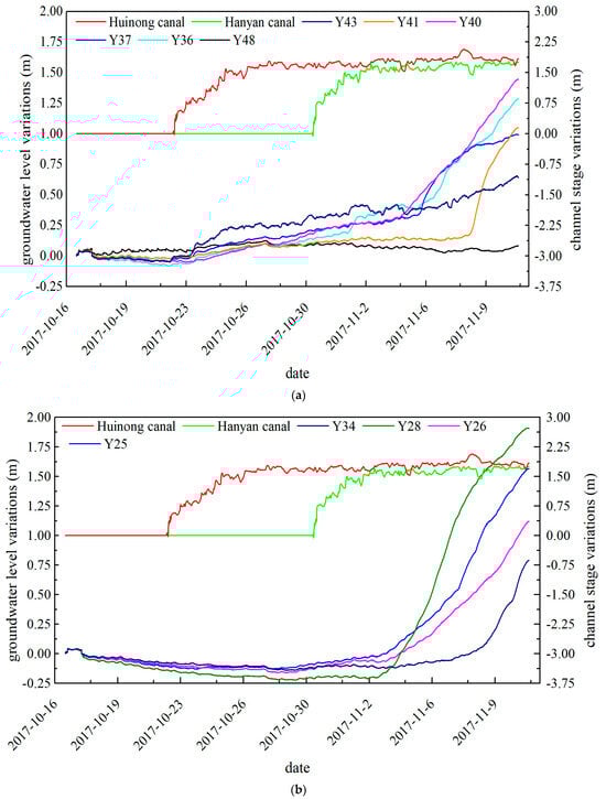 Figure 4a presents the groundwater level variations near Huinong Canal (Y36, Y37, Y40, Y41, Y43, Y48). As shown in the Figure 4a, the groundwater level near the Huinong Canal is affected significantly by the canal stage in the Huinong Canal (from 5 cm to 30 cm within 7 days). On the other hand, the water level of Hanyan Canal has a minor effect on the nearby groundwater level variations (Figure 4b, wells Y25, Y26, Y28, and Y34). This is also closely related to the groundwater flow direction, where the overall groundwater flows from southwest to northeast. Prior to the release of water from the two irrigation canals on 22 October, the groundwater level in all monitoring holes maintained a decreasing trend (approximately 1 to 2 cm per day) due to the influence of coitional factors such as evaporation or other pumping actions. From day 19 (5 November 2017) onwards, the groundwater levels in all monitoring wells increased significantly, which is caused by large-scale agricultural irrigation in the area.