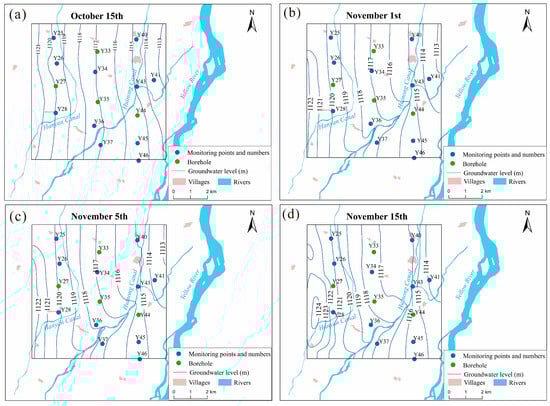 The regional groundwater level flow field variation map at different times (a) 15th October (b) 1st November (c) 5th November (d) 15th November.