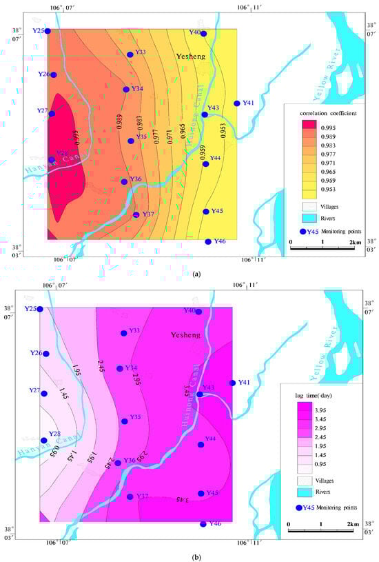 In order to study the interaction between groundwater level variations and irrigation channel stage variation, the correlation between the groundwater level changes in the monitoring wells at different locations and irrigation channel stage was investigated by mutual correlation analysis. The spatial lag characteristics of the groundwater level on the irrigation channel diversion were obtained through the correlation analysis evaluation using irrigation channel stage and groundwater level data of Hanyan Canal as signal sources, and the contour plots of the correlation coefficients and lag times were drawn in Figure 6a,b. The maximum correlation coefficient between the groundwater level of each monitoring well and irrigation channel stage variation is above 0.9, indicating that there is an obvious correlation between the irrigation channel stage and the fluctuation of the surrounding groundwater level, and the change of the irrigation channel stage can obviously cause the fluctuation of the surrounding groundwater level. However, the maximum correlation coefficient decreases as the distance of the observation borehole from the irrigation channel increases; the lag time increases, i.e., the lag time increases from approximately 0.5 days for every 0.3 km to approximately 0.5 days for every 1 km. Through the trend of spatial changes in lag time and correlation coefficient, it can be judged that the groundwater flow shows a uniform flow direction from northwest to southeast. The signal of the fluctuation of irrigation channel stage can be propagated to the aquifer far away from the irrigation channel.