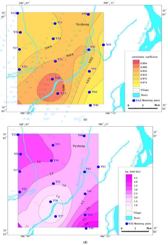 The spatial distribution map of the correlation coefficient and the lag time between the irrigation canal and the groundwater under the diversion irrigation (a) correlation coefficient through Hanyan Canal. (b) the lag time through Hanyan Canal. (c) correlation coefficient through Huinong Canal. (d) the lag time through Huinong Canal.