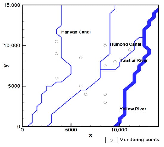 The annual precipitation in Qingtongxia Irrigation Area is scarce, and the source of groundwater recharge in this area is mainly the seepage from the canal system and field irrigation. The stratum of the irrigation area is dominated by the loose sediments of the Yellow River alluvial fan, and the aquifers are highly permeable and relatively uniform in spatial distribution, which reduces the interference of the geologic complexity on the parameters identification. The irrigation area has two main canals, Hanyan Canal and Huinong Canal, and the irrigation system is as dense as a network, and summer and winter irrigation are carried out every year, which provides a natural and repeatable “stimulation source” for the study of the dynamic response of groundwater due to the artificially controlled regular changes of the canal level.