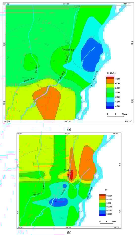 Regarding the regional hydrogeological conditions, the southern area belongs to the middle and front part of the Qingtongxia Yellow River alluvial fan, and the permeability coefficient is slightly larger. The lithology of this area is mainly gravel and sandy gravel. Moving northward to the Yellow River alluvial plain, the lithology gradually transitions to medium-fine sand and powder-fine sand with clayey soil, so the distribution of the permeability coefficient is also larger in the south than in the north. From the site distribution of permeability coefficient (Figure 8a), the overall permeability coefficient shows spatial variation with some heterogeneity, but the overall variation is not large. Moreover, the results of this simulation are more reflective of the non-homogeneity of the aquifer when compared with the previous simulations [37,45].
