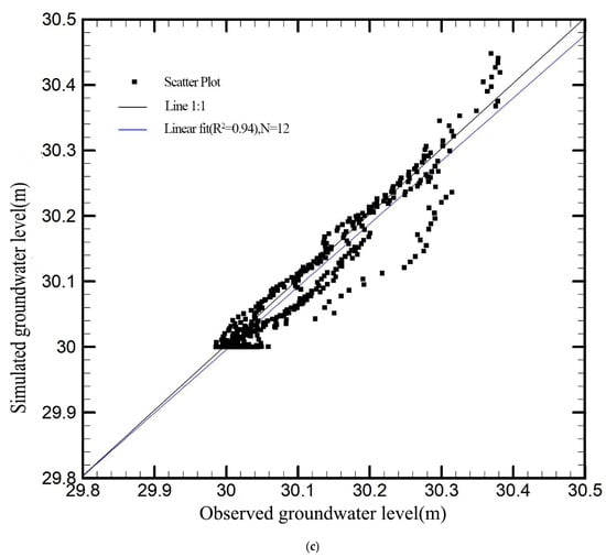 Figure 8a,b illustrate the estimated T and Ss fields. The scatterplot of calibrated verses observed groundwater level variations is presented in Figure 8c. The unbiased groundwater levels scattering along the 45 degrees line suggest the estimated parameter fields are reasonable. As shown by the Figure 8a,b, the T values are slightly larger on the south, intermediate on the northwest, and smaller on the northeast. On the contrary, the Ss values are smaller on the south, intermediate on the northwest, and larger on the northeast. Although the estimated T and Ss fields show some spatial variabilities, they are not significant. The maximum and minimum values are within the same order of magnitude. Thus, the hydraulic properties of this region can be treated as homogeneous. This is consistent with the previous research results in the local area [37,45]. The permeability coefficients identified by previous authors in the southern part of the region are around 6.8, and around 5.1 in the northern part, indicating that the hydraulic parameters inversed using the SLE inversion method with the river stage tomography method are consistent with the actual system. Studies in the Indo-Gangetic Basin report T values of 3–15 m/d for alluvial systems under comparable climatic conditions [31]. This consistency underscores the reliability of natural stimuli methods in capturing aquifer heterogeneity.