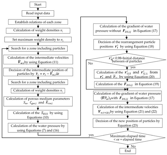 The analysis flowchart for the MPS method is shown in Figure 1. In the preparation for this numerical simulation, the relationships between each zone in which particles are located and the weight densities of the particles as well as the reference weight density of the particles must be obtained. Next, the intermediate velocities and the intermediate positions of the particles after moving at the intermediate velocities must be obtained. The weight densities of the particles are calculated again, and the zone in which the particles are located is searched. Then the porous medium parameters for unsaturated properties, such as water saturation, the specific water capacity, and the relative permeability to water, are calculated. Furthermore, after the calculation of , the water pressures of the surface water and groundwater are calculated.