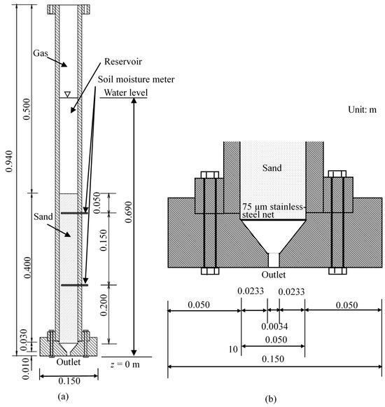 Schema of the column experiment apparatus. All values are in meters unless otherwise specified: (a) overall view; (b) enlarged view around the outlet.