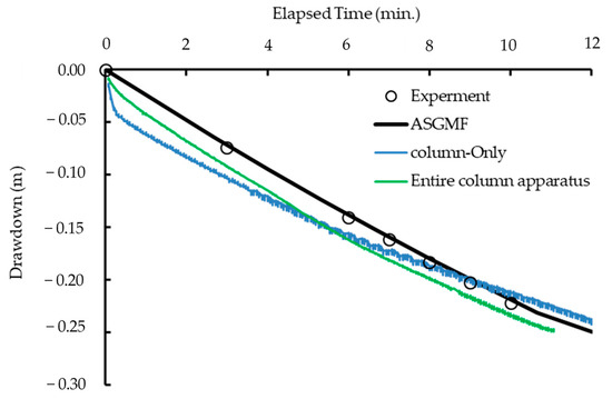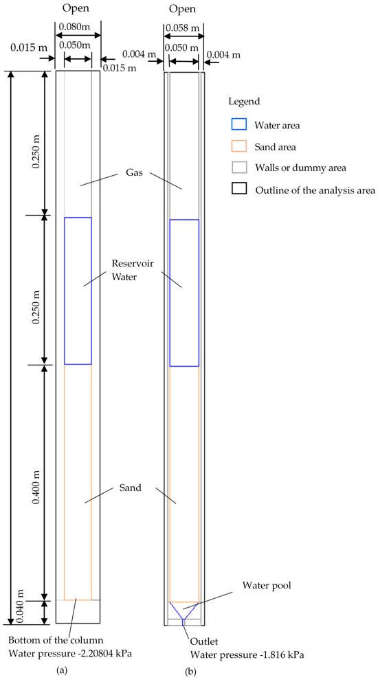 In this study, two cases were numerically simulated: in the first case, only the column without the bottom plate was considered (Figure 3a); in the second case, the entire column apparatus was considered (Figure 3b). When the bottom plate is removed (as in Figure 3a), the water flow is one-dimensional downward. By contrast, when the entire column apparatus is used in the simulation, the water in the water pool below the column flows either three- or two-dimensionally, and the water pressure is negative because of the extraction of water from the bottom of the water pool. However, the water in the column above the water pool flows one-dimensionally when the entire column is used, just as it flows when only the column is used in the simulation.