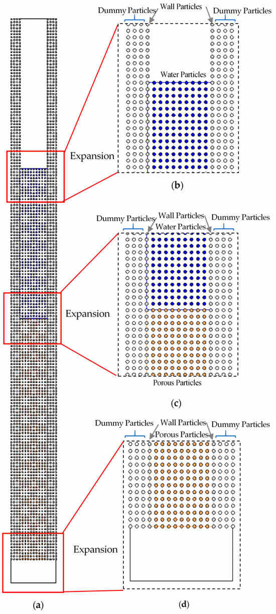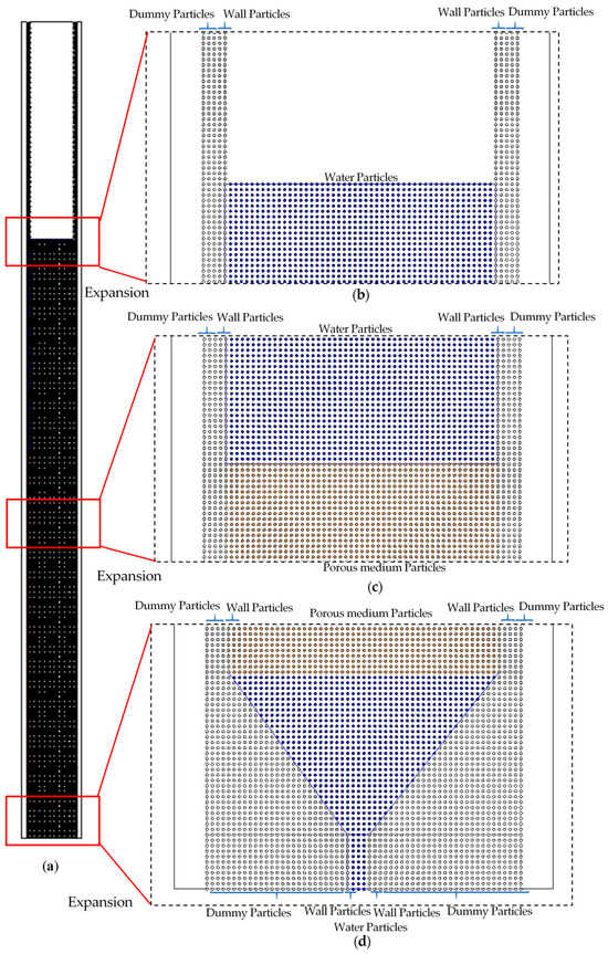 The analytical domain and initial particles distribution for the entire column apparatus simulation: (a) overview; (b) surface water; (c) boundary between surface water and sand; (d) bottom of the column. The blue circles are surface water, the orange circles are a porous medium, the gray circles are walls and the white circles are dummies.
