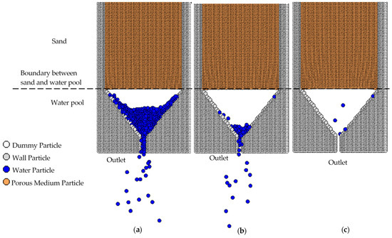 In the developed numerical simulations, the water pressure of the SPPs can also be imposed as a non-zero gas pressure. Because the water pool and the outlet were filled with water particles, as presented in the results, the imposition of non-zero gas pressures of the SPPs made it possible to obtain a negative water pressure where the water had been extracted, which in this study was imposed as −3.0 kPa of the SPPs in the water pool. However, the standard SPP method, in which a water pressure of zero is imposed, can still be employed in the atmosphere, as shown by the distribution of particles and water pressure obtained in both the column-only and the entire column apparatus numerical simulations.