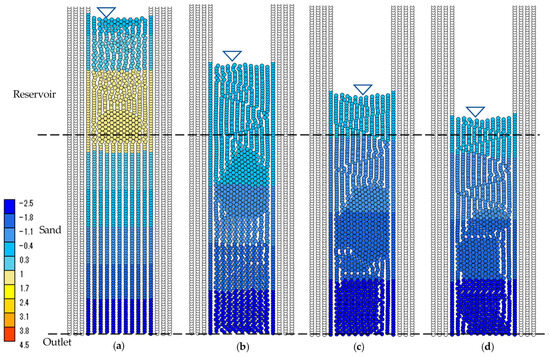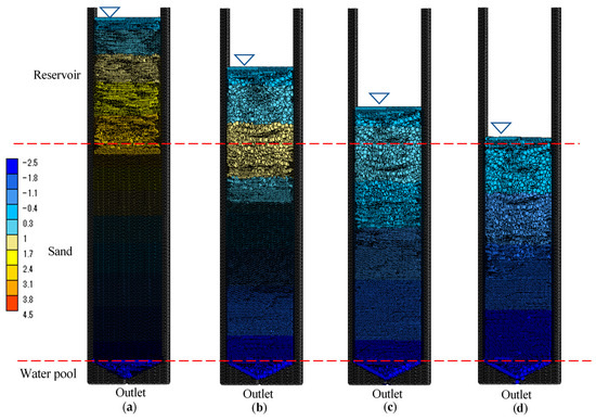 Similar to the water pressure when there were still water particles in the reservoir, the water pressure decreased linearly to the imposed water pressure of −2.20804 kPa in the column-only simulation and to about −2.2 kPa in the entire column apparatus simulation at the lower boundary of the sand (Figure 12). When there were no water particles remaining in the reservoir, unlike when the reservoir contained water particles, the water pressure in the sand in the entire column apparatus simulation was similar to that in the column-only simulation. Under this condition, the water pressure distribution did not oscillate in either simulation (Figure 12a–d). In addition, the water pressure at the top surface of the sand was not zero when there were no particles in the reservoir. This result indicates that the water pressure could be negative without being affected by the atmospheric pressure, and the water saturation could decrease to less than 1.0, at the boundary between the sand and the reservoir.