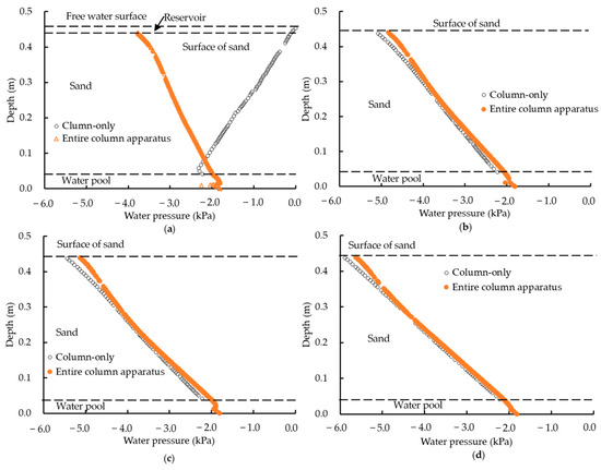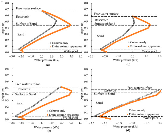 Comparison of the vertical distribution of the water pressure when no reservoir was present in the results of the column-only and the entire column apparatus numerical simulations. Elapsed time at (a) 700 s, (b) 1200 s, (c) 1800 s, and (d) 4800 s.