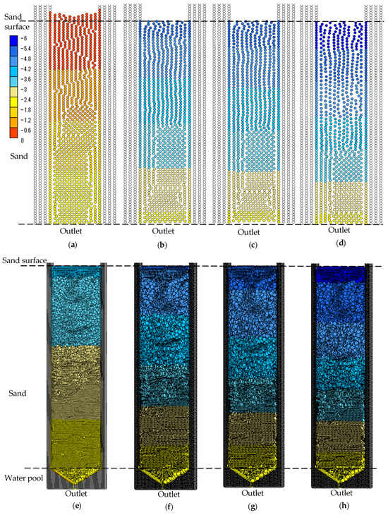 There was no water in the reservoir by the elapsed time of 776 s in the column-only simulation and by the elapsed time of 664 s in the entire column apparatus simulation. The arrangement of the particles after no water remained in the reservoir is shown in Figure 11. Water was still present in the reservoir at the elapsed time of 700 s in the column-only simulation (Figure 11a); whereas, in the entire column apparatus simulation, all water particles in the reservoir had infiltrated into the sand by the elapsed time of 700 s. In both simulations, the height of the top of the sand became constant after all water particles had infiltrated into the reservoir. However, the weight density of the particles in the column-only simulation was lower after the elapsed time of 776 s than before that time (Figure 11a–d). In particular, the distribution of particles in the upper part of the sand was much less dense at the elapsed time of 4800 s than at the elapsed time of 700 s (Figure 11a–d). With elapsed time, the mass of particles with a high weight density moved to the lower edge. By contrast, the distribution of particles in the entire column apparatus simulation did not display a dense gathering of a mass of particles or an area with a lower weight density of particles (Figure 11e–h).