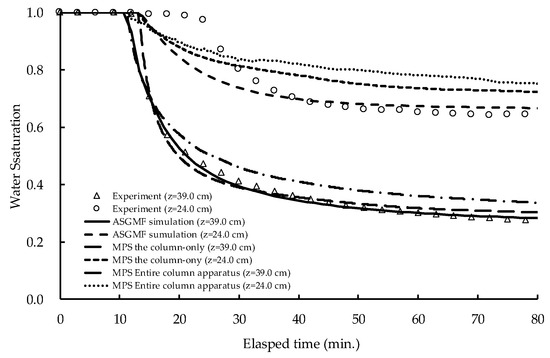 Comparison of the decrease in water saturation during drainage between the experimental and numerical simulation results obtained in the column-only and the entire column apparatus simulations by the MPS method and by the ASGMF method.