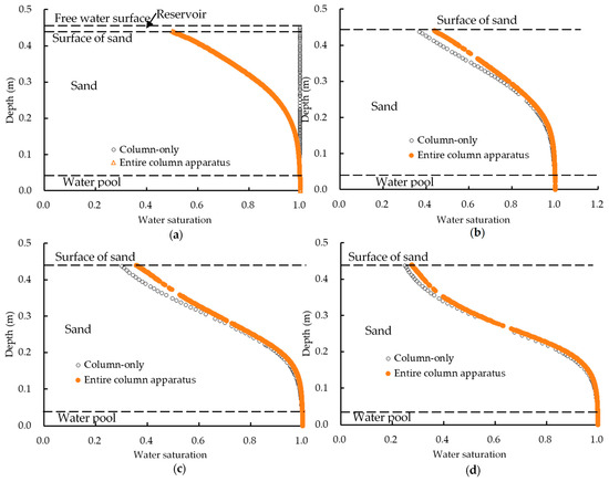 Comparison of the vertical distribution of water saturation when no reservoir was present in the results of the column-only and the entire column apparatus numerical simulations. Elapsed time at (a) 700 s, (b) 1200 s, (c) 1800 s, and (d) 4800 s.