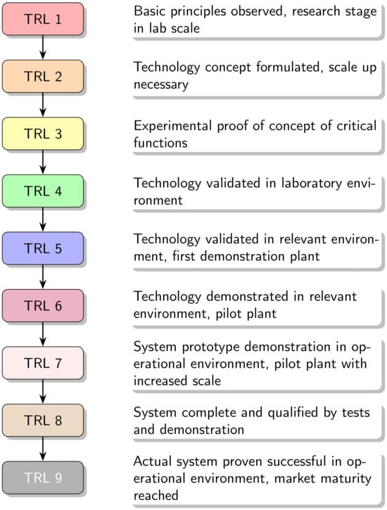Recognizing the diversity within each technological category, the Technology Readiness Level (TRL) is presented as a general indicator of development and market maturity. This concept was first introduced in 1995 by the NASA space technology [91] and is shown in Figure 2, where the TRL concept is transferred to water related technologies, ranging from 1 (concept stage) to 9 (fully market-ready). However, it is important to note that technologies within the same category may vary significantly in their TRL. For instance, while conventional reverse osmosis desalination systems are typically at TRL 9 due to widespread deployment, emerging desalination methods such as forward osmosis or capacitive deionization may range between TRL 5 and 7, depending on their level of validation. Breakthrough concepts, like solar desalination integrated with advanced materials, might remain at early research stages (TRL 2–3).