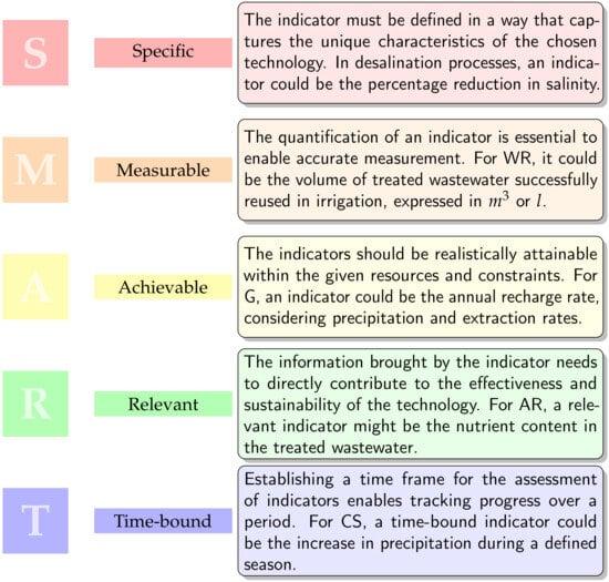 Figure 3 shows the SMART concept and gives some examples that can be applied for the respective technology indicator in water treatment technologies. In order to make them more meaningful in the context of non-conventional water technologies, it is important to understand that the chosen indicators should fulfill the SMART criteria.