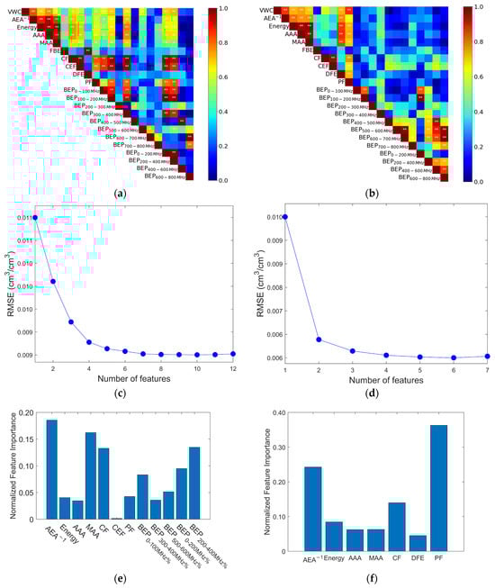 - Select the features that are significantly correlated with SVWC to form different feature sets and use the best subset selection (BSS) algorithm to plot the curve of the RMSE as a function of the number of features. The BSS algorithm evaluates all possible combinations of features [46,47]. Typically, the RMSE decreases rapidly with fewer features, and as the number of features increases, the rate of decrease in the RMSE slows down or levels off. Therefore, the optimal number of features is usually located at the inflection point where the RMSE begins to level off after a rapid decline.