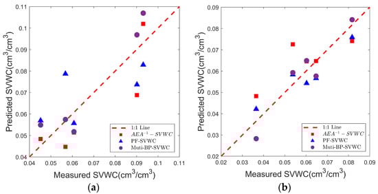 - The optimal feature parameter combination, identified through multiple feature selection methods, effectively reduces model complexity and minimizes redundant information. The Muti-BP-VWC model, compared to SVWC prediction models based on single-feature linear regression, significantly improves prediction accuracy. In the unmined area validation set, the model achieved an R2 of 0.84 and an RMSE of 0.0059 cm3/cm3; in the mined area validation set, the R2 was 0.77 and the RMSE was 0.0091 cm3/cm3. The model also demonstrated excellent generalization capability, making it suitable for SVWC inversion.