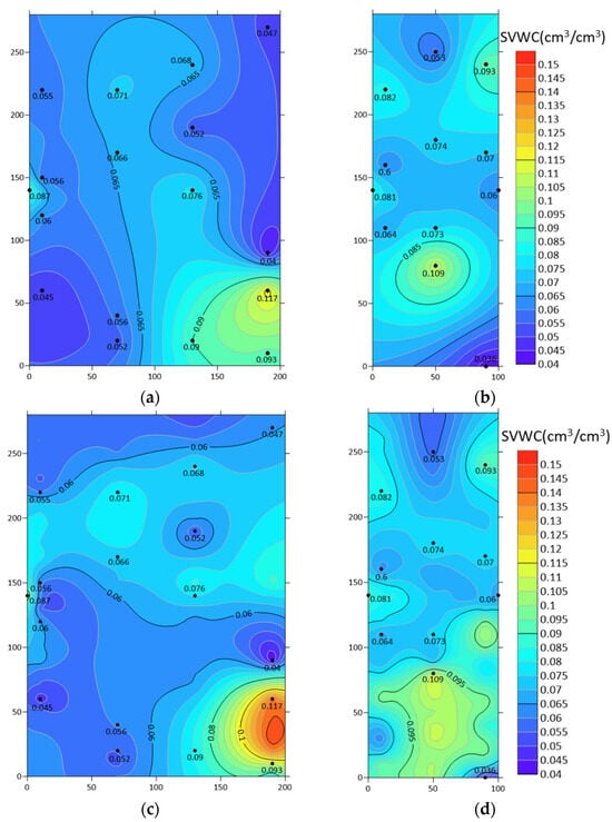 - The SVWC contour maps derived from the Muti-BP-VWC model showed trends consistent with those measured by TDR. With its dense sampling points, GPR provided more detailed spatial distribution information on soil moisture in local regions, demonstrating its practical value in large-scale, rapid soil moisture detection. The inversion results indicated that the average SVWC difference between the mined and unmined areas was less than 0.01 cm3/cm3, suggesting that coal mining has minimal impact on shallow subsurface soil moisture.