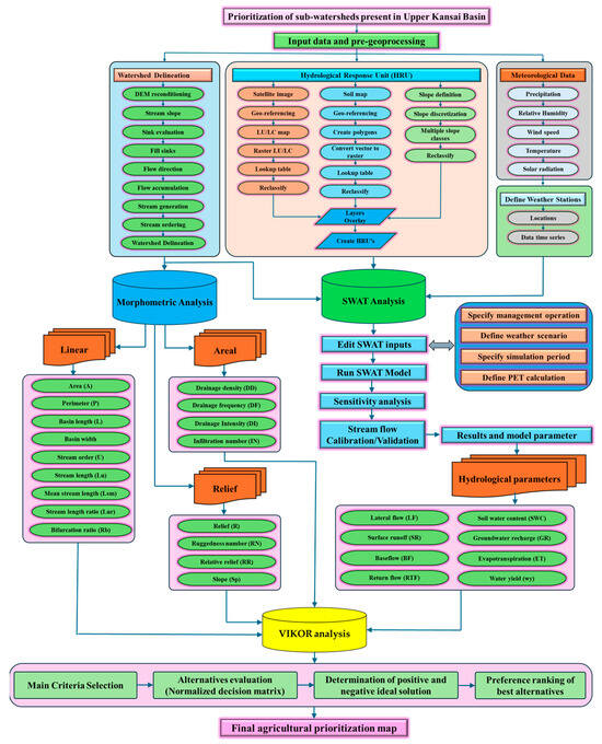 This study addresses critical gaps in agricultural land suitability assessment by implementing a comprehensive methodological framework that integrates three complementary analytical approaches for complex, urbanizing riverine basins in developing countries. The methodology uniquely combines SWAT modeling, morphometric analysis, and VIKOR-based multi-criteria decision-making (MCDM) to assess and prioritize agricultural land in the Upper Kansai Basin (Figure 2).