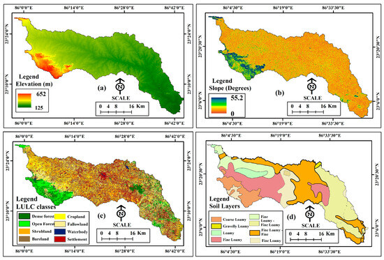 The basin’s topography is stratified by residual soil formed through the erosion of previous geological layers [69]. The soils of the study area can be categorized into two types. The soil in the upper catchment areas and over the plateau slope is skeletal, thin, gravelly, and lateritic in nature. In the lower areas, predominantly sandy loam soil can be found.