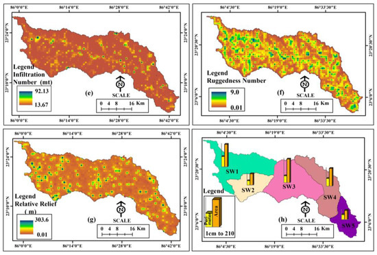 The relief parameters exhibit considerable variation across the basin. The ruggedness number (Figure 5f) ranges from ~0.01 to 9.0, with SW2 showing the highest value (~2.0), indicating steep terrain and high erosion susceptibility. The relative relief map (Figure 5g) shows values ranging from ~0.01 to 303.57 m, with SW1 exhibiting the highest value (~303), suggesting significant topographic variation. These relief characteristics strongly influence the basin’s hydrological response and erosion potential [82]. Higher relief values generally correspond to areas of increased erosion risk and reduced agricultural suitability.