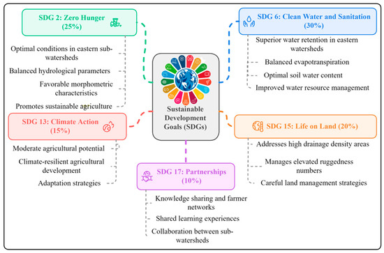Prioritizing agricultural land use is a significant challenge for sustainable development in the rapidly urbanizing, semi-arid riverine basins of South Asia, especially under climate variability and water scarcity. This study introduces a systematic framework combining remote sensing and geospatial data with the Soil and Water Assessment Tool (SWAT) model, morphometric analysis, and VIKOR-based Multi-Criteria Decision Analysis (MCDA) to effectively identify Agricultural Land Prioritization (AgLP) areas in the Upper Kansai Basin, India, while reducing the environmental impact, in line with Sustainable Development Goals (SDGs). The SWAT model simulation reveals varied hydrological patterns, with basin water yields from 965.9 to 1012.9 mm and a substantial baseflow (~64% of total flow), emphasizing essential groundwater–surface water interactions for sustainable agriculture. However, the discrepancy between percolation (47% of precipitation) and deep recharge (2% of precipitation) signals potential long-term groundwater challenges. VIKOR analysis offers a robust prioritization framework, ranking SW4 as the most suitable (Qi = 0.003) for balanced hydrological and morphometric features, in agreement with the SWAT outcomes. SW4 and SW5 display optimal agricultural conditions due to stable terrain, effective water retention, and favorable morphometric traits (drainage density 3.0–3.15 km/km2; ruggedness 0.3–0.4). Conversely, SW2, with high drainage density (5.33 km/km2) and ruggedness (2.0), shows low suitability, indicating risks of erosion and poor water retention. This integrated AgLP framework advances sustainable agricultural development and supports SDGs, including SDG 2 (Zero Hunger), SDG 6 (Clean Water), SDG 13 (Climate Action), and SDG 15 (Life on Land). Incorporating hydrological dynamics, land use, soil properties, and climate variables, this approach offers a precise assessment of agricultural suitability to address global sustainability challenges in vulnerable riverine basins of developing nations.