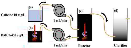 A bench-scale CMFR was constructed, as shown in Figure 2. The whole CMFR system comprised (1) a 1 L beaker (a) with 10 mg/L caffeine solution; (2) a 1 L beaker (b) where 2 g/L of BMCG450 suspension was constantly agitated with an overhead stirrer (Corning, Corning, NY, USA) to ensure homogeneous adsorbent concentrations; (3) a 750 mL reactor (c), where the adsorbent and sorbate were mixed with an overhead stirrer (Corning, USA); and (4) an 800 mL clarifier (d), where the treated solution was collected and the adsorbent settled out of the solution. Hydraulic retention time (HRT—contact time between adsorbents and sorbates in reactors), sorbate concentration, and adsorbent amount are essential factors affecting the design and performance of the reactor. To initiate the adsorption experiment in the CMFR, adsorbent and caffeine were pumped with tube pumps (Masterflex L/S, Vernon Hills, IL, USA) from reactors (a) and (b) at a flow rate of 1 mL/min. Thus, the adsorbent concentration in reactor (c) was 1 g/L, and the caffeine concentration was 5 mg/L. The mixture in reactor (c) then flowed into reactor (d). In reactor (d), the adsorbents settled down in the container, and the effluent was collected to measure the caffeine concentration.