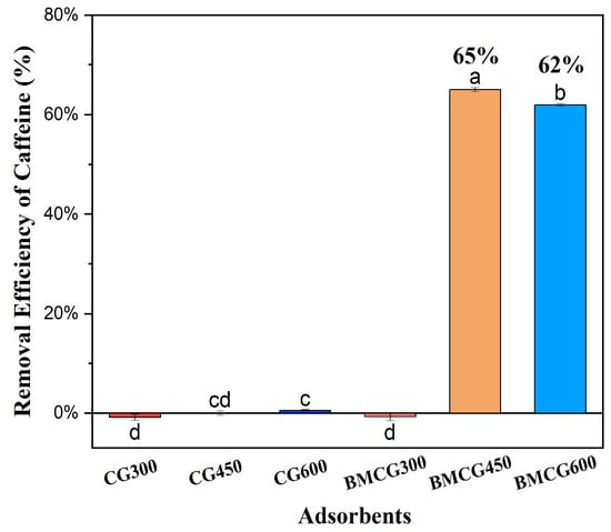 Removal efficiency of caffeine by different biochar adsorbents. Means with the same letter are not significantly different at the significance level of 0.05.