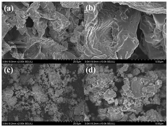 SEM images of CG450 at (a) 2.00k× and (b) 10.00k× magnifications and BMCG450 at (c) 2.00k× and (d) 10.00k× magnifications.