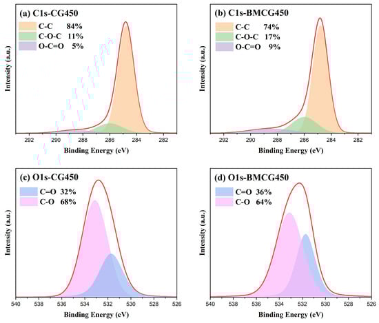XPS spectra of (a) C1s-CG450, (b) C1s-BMCG450, (c) O1s-CG450, and (d) O1s-BMCG450.