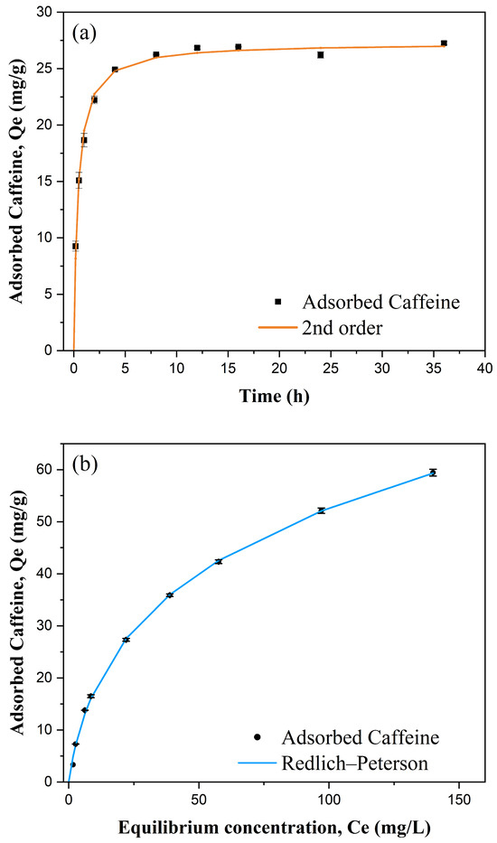 3.3. Caffeine Adsorption Kinetics and Isotherms
