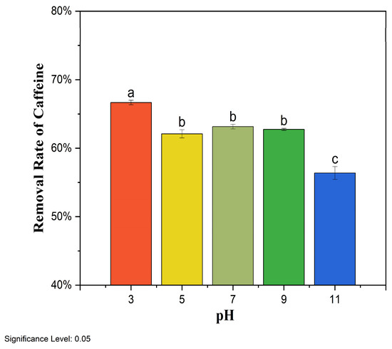 Effect of pH on the removal of caffeine by BMCG450. Means with the same letter are not significantly different at the significance level of 0.05.