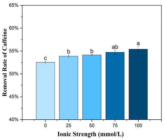 Effect of ionic strength on the removal of caffeine by BMCG450. Means with the same letter are not significantly different at the significance level of 0.05.