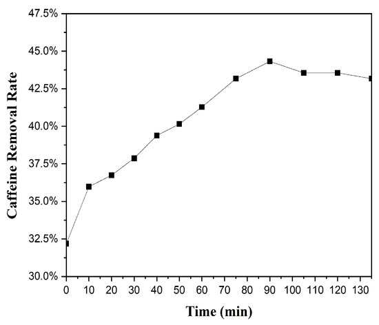Caffeine removal by BMCG450 under continuously flowing conditions was determined in the CMFR. During the operation, the removal rate of caffeine by BMCG450 increased with time until the reaction system reached equilibrium and stability after about 90 min, and then the removal rate remained at about 43% (Figure 10). There was no concentration breakthrough during the experiment, indicating that BMCG450 effectively removed caffeine from the water. This removal efficiency can be further enhanced by adjusting the caffeine concentration, BMCG450 dosage, or flow rate. The results from the CMFR indicated that BMCG450 can serve as an effective adsorbent under continuous flow conditions for the fast and convenient removal of caffeine from water.