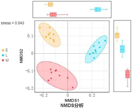As shown in Figure 3, the initial, middle, and late stages are distant from each other, with tight clustering among groups, indicating good sample data and significant differences in community structure among different culturing periods under the Integrated IMTA mode. The stress coefficient (Stress) based on this algorithm is 0.043, indicating a good fit of the results and their ability to accurately reflect the composition of the microbial community.