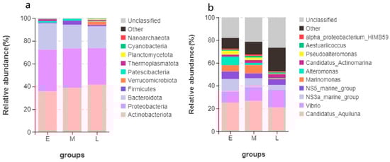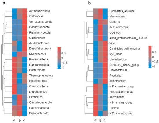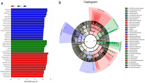 Based on the above analysis, it is concluded that there are significant differences among the three periods of the IMTA water microbial community. To further identify the species with significant differences between groups, LEfSe analysis was used to identify characteristic communities with significant abundance differences, with the results shown in Figure 4. Based on the LEfSe LDA scores presented in Figure 4a, 39 microbial taxa with LDA values above 4.0 showed significant differences, among which 19 were enriched in the E group, 7 were enriched in the M group, and 14 were enriched in the L group. According to Figure 4b, the enrichment in Group E includes Vibrio, Ilumatobacteraceae, Verrucomicrobiota, etc.; the enrichment in Group M includes Marinomondaceae, Candidatus_Aquiluna, Firmicutes, etc.; and the enrichment in Group L includes Alphaproteobacteria, NS3a_marine_group, Flavobacteriaceae (from order to family), etc.