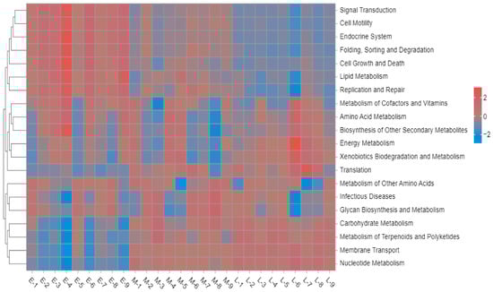 The KEGG functions of the microbial community were predicted using Tax4Fun. Figure 7 shows that, compared to the initial stage (E), the metabolic pathways such as amino acid metabolism, biosynthesis of other amino acids, energy metabolism, metabolism of terpenoids and polyketides, and membrane transport are upregulated in the late stage (L). Conversely, compared to the initial stage (E), the metabolic pathways such as signal transduction, lipid metabolism, cofactor and vitamin metabolism, and cell growth and death are downregulated in the late stage (L).