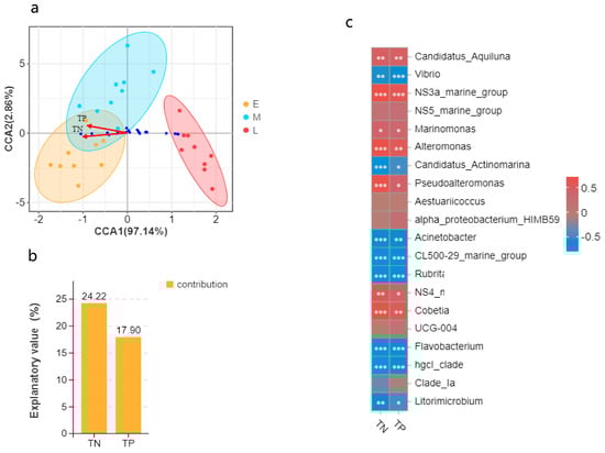 CCA, environmental contribution degree, and Pearson analysis of various environmental factors in IMTA Model Water. Note: (a) CCA; (b) environmental contribution analysis; (c) the x-axis and y-axis are environmental factors and species, respectively. The correlation between R and P are obtained by calculation. R values are shown in different colors, and the legend on the right is the color range of different R values. * 0.01 < p ≤ 0.05; ** 0.001 < p ≤ 0.01; *** p ≤ 0.001.