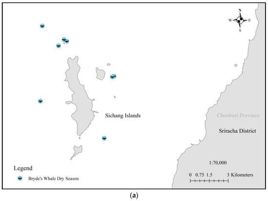 Based on data from the Department of Marine and Coastal Resources (DMCR), Bryde’s whales are spotted less frequently around the Sichang Islands compared to other areas, possibly due to differences in food availability, habitat conditions, or human activities that may affect their presence. The limited sightings of Bryde’s whales around Sichang Islands can be explained by Tongsukdee et al.’s study on Bryde’s whale sightings in the Gulf of Thailand (2010–2021) [5], who found that Bryde’s whales in the Gulf of Thailand are primarily semi-resident with distinct population groups. Mother whales remain in the upper Gulf to nurse their calves, while weaned juveniles migrate elsewhere for feeding or breeding, as shown in Figure 15. Moreover, the previous study in these areas indicates that every year, there is a period from December to March when Bryde’s whales are rarely sighted. After this period, they return to feed in the upper Gulf of Thailand. This pattern suggests that this group of Bryde’s whales exhibits semi-resident behavior and may migrate elsewhere for breeding [47], since Sichang Islands are not a known nursing ground and migrating juveniles are likely dispersed across wider areas for breeding. This explains why Bryde’s whales can be observed in this area only during certain periods.