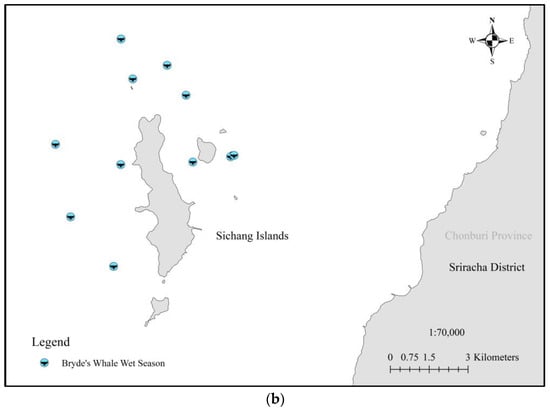 The map depicts the occurrences of Bryde’s whale sightings during (a) the dry season and (b) the wet season.