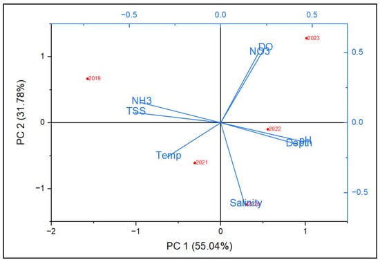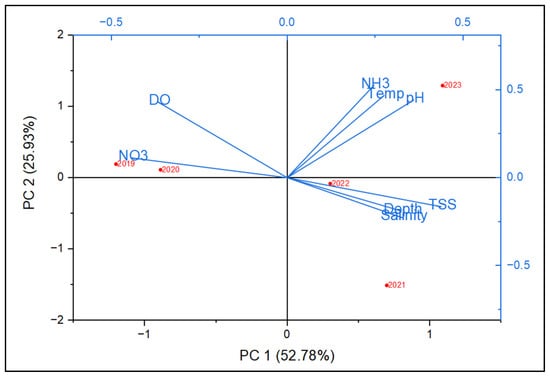 Principal Component Analysis (PCA) for dry season. The red dots represent different years (2019–2023) and each blue arrow represents a water quality variable. The observed shifts in water quality parameters across years highlight potential environmental changes. The high TSS and NH3 levels in 2019 may have resulted from increased sedimentation or pollution events. Conversely, the higher DO and NO3 in 2023 could indicate increased biological productivity, nutrient loading from external sources, or improved water mixing processes. The decreasing salinity trend in 2023 suggests possible freshwater inputs, which could be due to increased rainfall, river discharge, or changing oceanographic conditions.