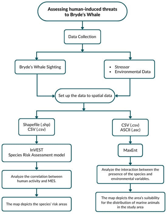 During the initial phase of our research, we employed the MaxEnt model to examine the relationship between different environmental variables and the occurrence of Bryde’s whale. This analytical tool enabled us to pinpoint the factors influencing the presence of this whale. Subsequently, we applied the SRA model to assess the potential threats posed by human activities to Bryde’s whale in Sichang Island. The data analysis process is shown in Figure 5.